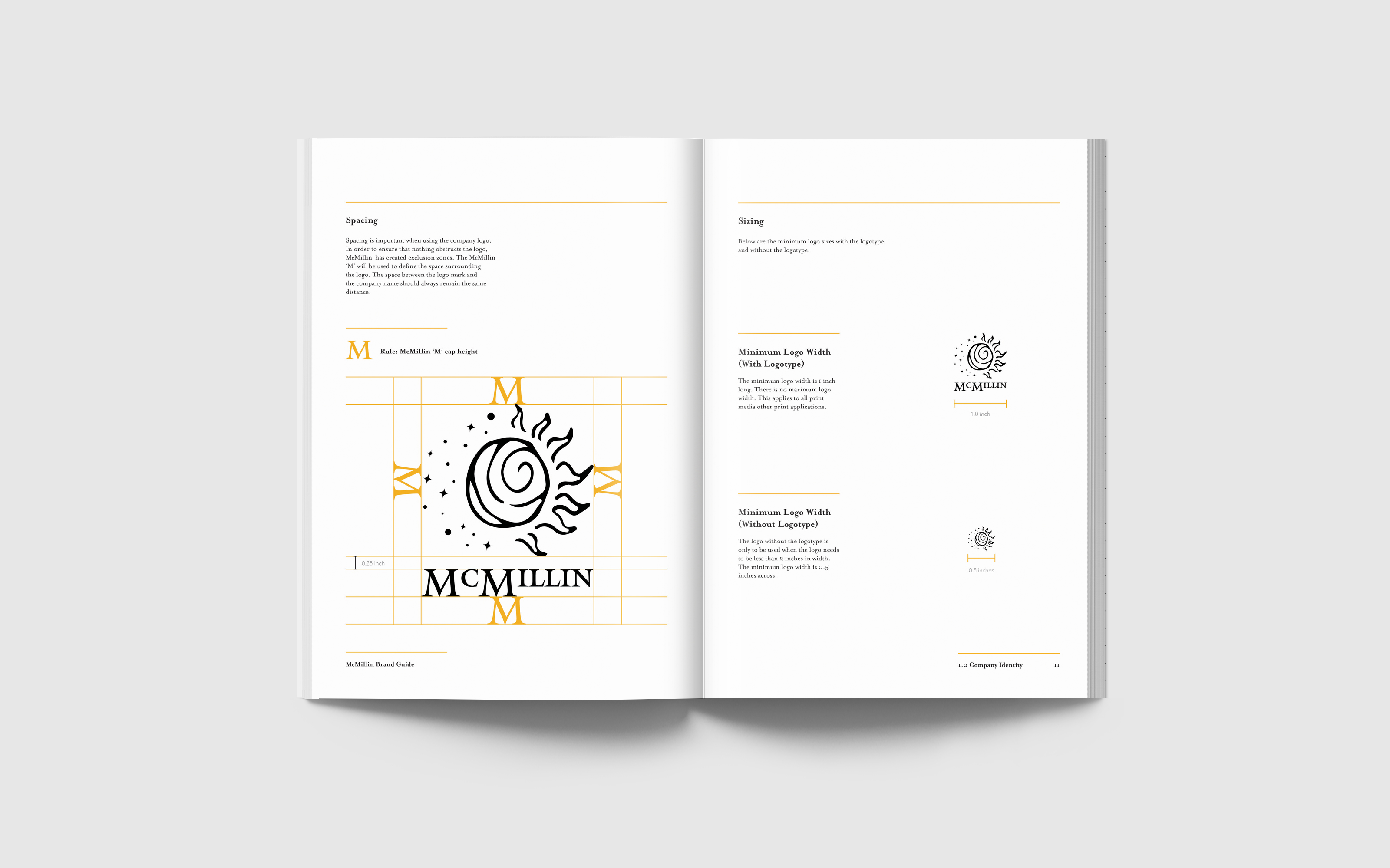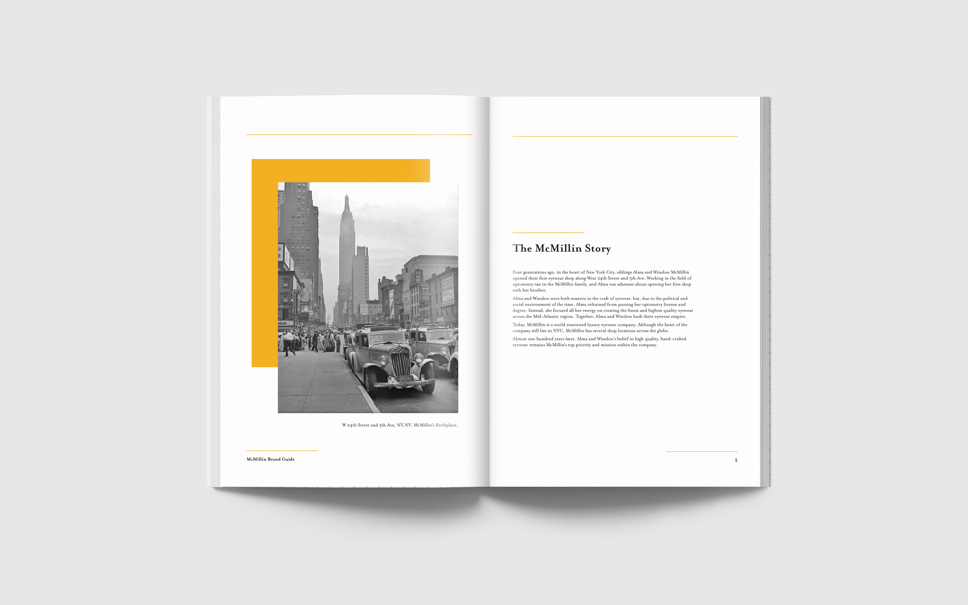 This is a company brand book for McMillin. McMillin is a luxury eyewear company based in New York City that specializes in custom-made frames and lenses.
