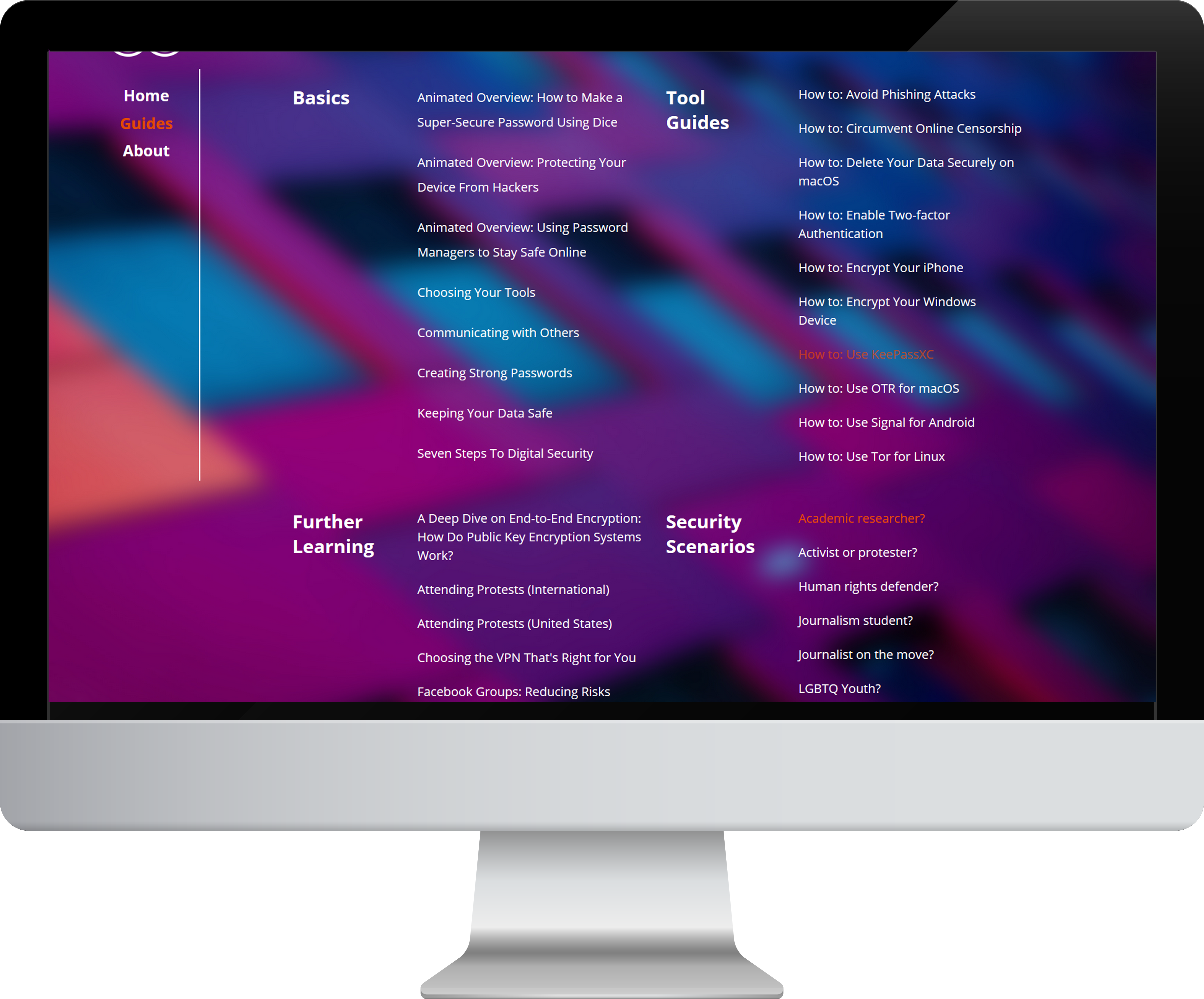 I was tasked with redesigning Surveillance Self-Defense’s website. The problem: visitors to the site were having trouble navigating around their website. So, I needed to create a compelling and visually interesting site that uses typographic hierarchy to guide visitors easily and swiftly around the website.